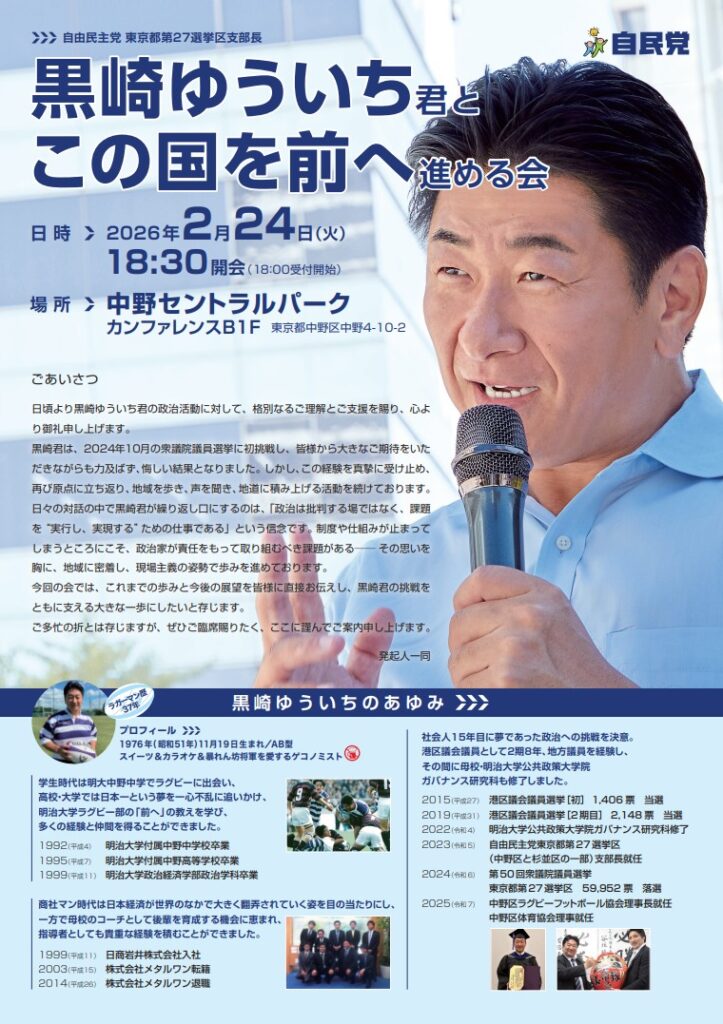 自由民主党 東京都第27区選挙区支部長「黒崎ゆういち君とこの国を前へ進める会」のご案内